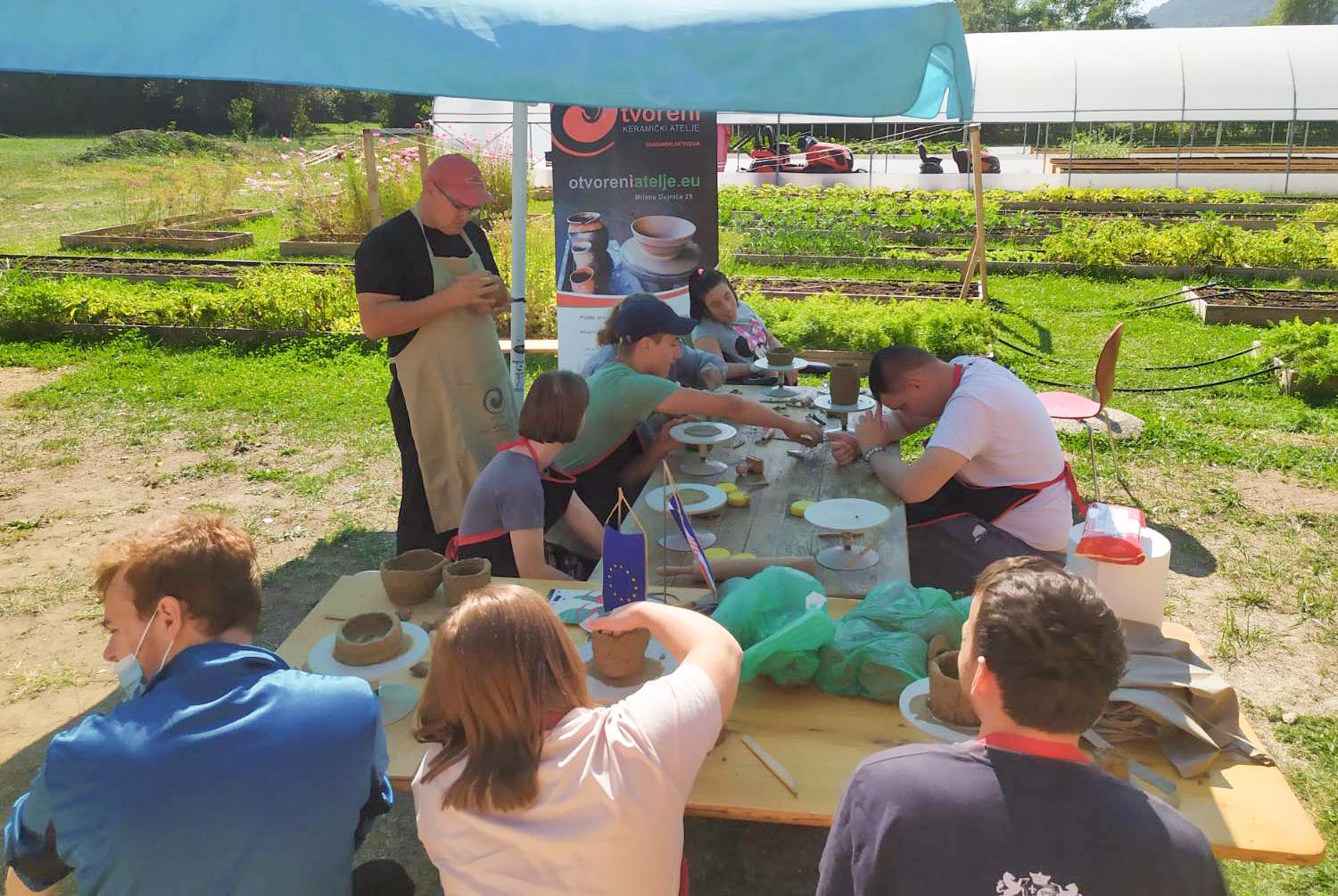 Kako bi se što bolje povezao sa zajednicom, Otvoreni keramički atelje je "prošetao" do idilične zelene doline ispod Hrastovačke gore. Tu se smjestila Inkluzivna farma koju vode Zeleno zlato i Udruga osoba s invaliditetom Sisačko-moslavačke županije koja je naš projektni partner. Ljepše vrijeme i bolje mjesto za radionicu oblikovanja gline nismo mogli zamisliti!
